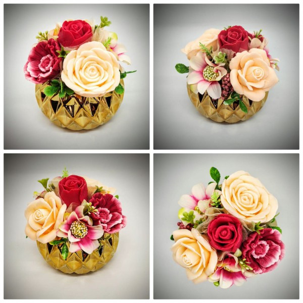 Szappanvirág csokor - piros-barack csokor - selyemvirággal - arany bordás kör kaspóban - 2. Kézzel készített, illatos szappan csokrok, asztali díszek, egyedi szappanok készítése.