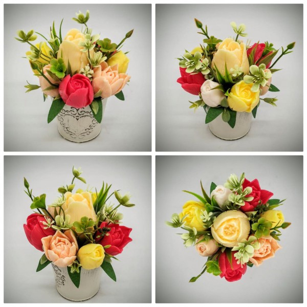 Szappanvirág csokor - piros-barack-sárga tulipán szappanvirág csokor - kicsi fém kaspóban - 1. Kézzel készített, illatos szappan csokrok, asztali díszek, egyedi szappanok készítése.