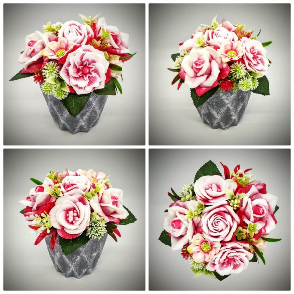 Szappanvirág csokor - piros-fehér csokor - szürke műanyag kaspóban