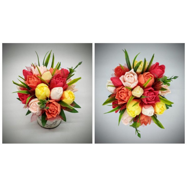 Szappanvirág csokor - piros-narancs-barack-sárga tulipán szappanvirág csokor - fém vödörben - 3.