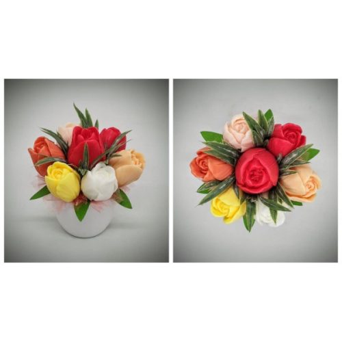 Szappanvirág csokor - piros-narancs-barack vegyes tulipán csokor - kis fehér kaspóban Kézzel készített, illatos szappan csokrok, asztali díszek, egyedi szappanok és fürdősók