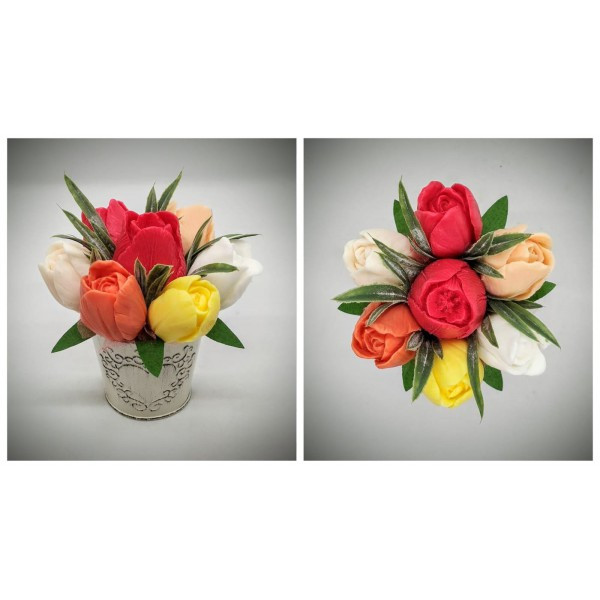 Szappanvirág csokor - piros-narancs-barack vegyes tulipán csokor - kis fém kaspóban - 2. Kézzel készített, illatos szappan csokrok, asztali díszek, egyedi szappanok és fürdősók