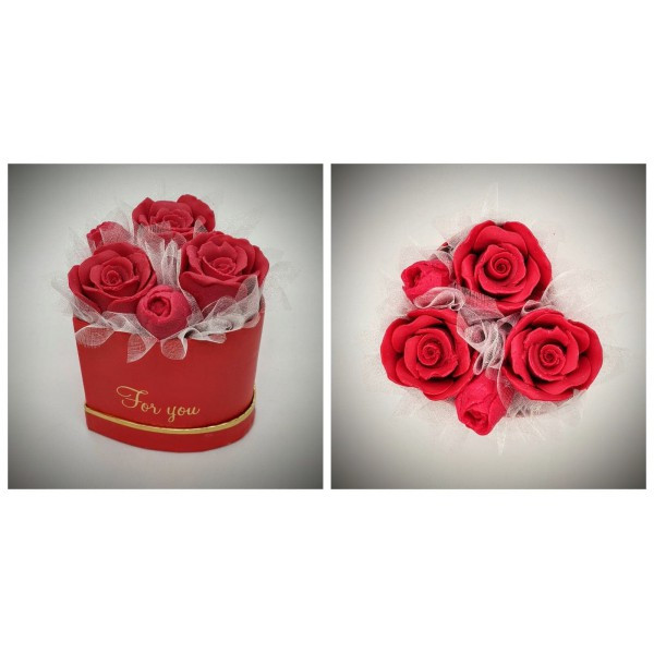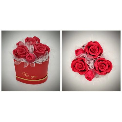 Szappanvirág csokor - Piros rózsa csokor - piros szívalakú dobozban Kézzel készített, illatos szappan csokrok, asztali díszek, egyedi szappanok készítése.