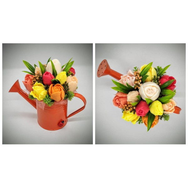 Szappanvirág csokor - piros-sárga-narancs vegyes tulipán szappancsokor - narancssárga locsolókannában - 11. Kézzel készített, illatos szappan csokrok, asztali díszek, egyedi szappanok készítése.
