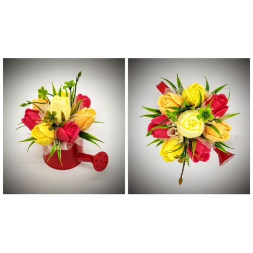 Szappanvirág csokor - piros-sárga tulipán csokor - piros színű locsolókannában Kézzel készített, illatos szappan csokrok, asztali díszek, egyedi szappanok készítése.