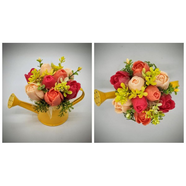 Szappanvirág csokor - piros-sárga tulipán szappanvirág csokor- - sárga locsoló kannában - 3. Kézzel készített, illatos szappan csokrok, asztali díszek, egyedi szappanok készítése.