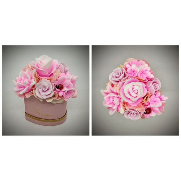 Szappanvirág csokor - Rózsaszín csokor - rózsaszín szívalakú dobozban Kézzel készített, illatos szappan csokrok, asztali díszek, egyedi szappanok készítése.