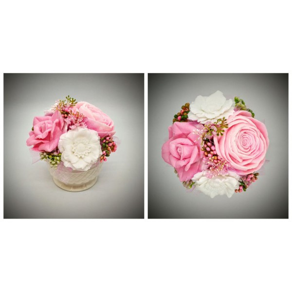 Szappanvirág csokor - rózsaszín - fehér csokor - közepes fehér kör kaspóban Kézzel készített, illatos szappan csokrok, asztali díszek, egyedi szappanok készítése.