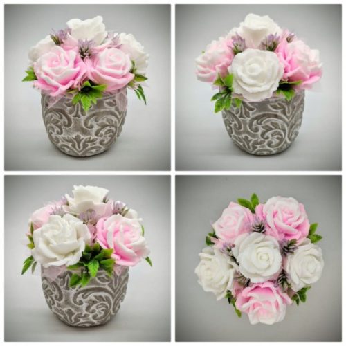 Szappanvirág csokor - rózsaszín - fehér - szappanvirág csokor - kőkaspóban - 3. Kézzel készített, illatos szappan csokrok, asztali díszek, egyedi szappanok készítése.