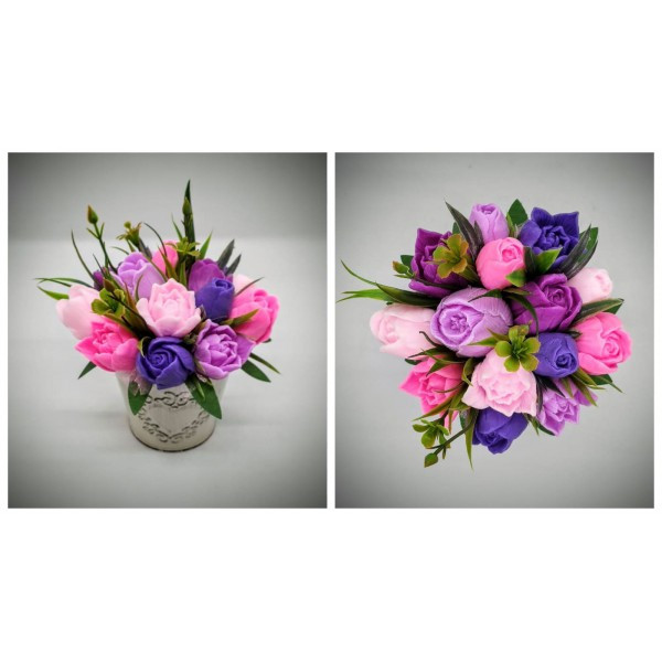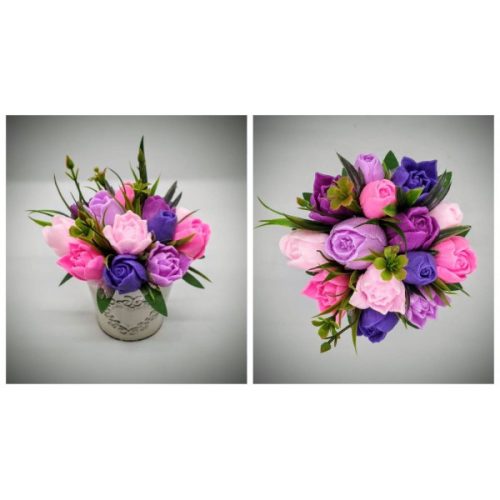 Szappanvirág csokor - rózsaszín-lila vegyes tulipán csokor - fém kaspóban - 5. Kézzel készített, illatos szappan csokrok, asztali díszek, egyedi szappanok és fürdősók