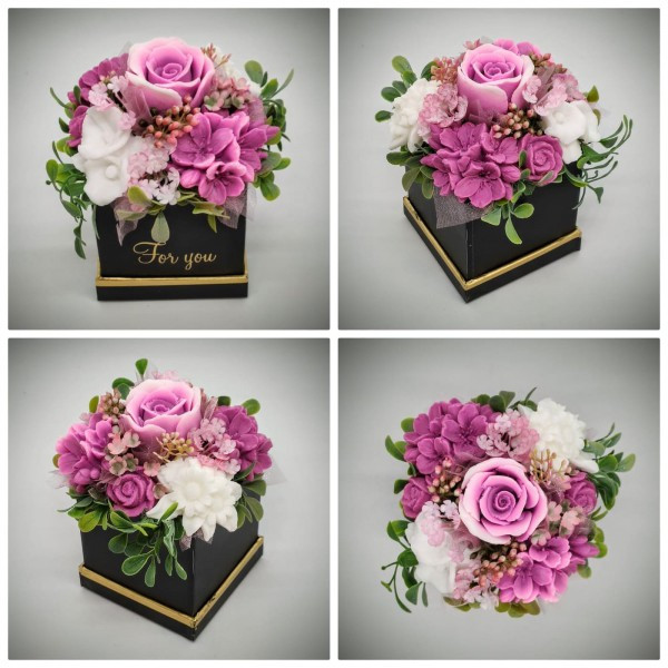 Szappanvirág csokor - rózsaszín-mályvás szappanvirág csokor - fekete kocka dobozban - 9. Kézzel készített, illatos szappan csokrok, asztali díszek, egyedi szappanok készítése.