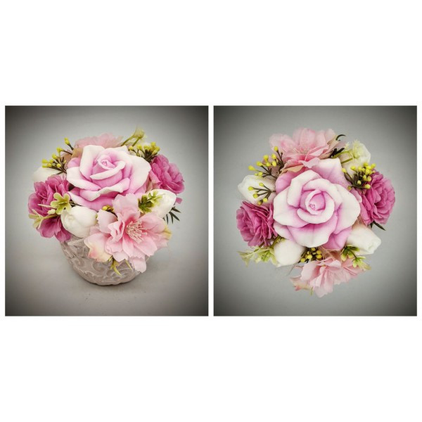 Szappanvirág csokor - rózsaszín nagy rózsa - selyemvirággal - kis fehér kőkaspóban -1.