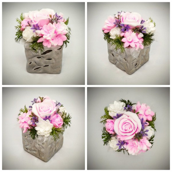 Szappanvirág csokor - rózsaszín szappanvirág csokor - ezüst kocka kaspóban Kézzel készített, illatos szappan csokrok, asztali díszek, egyedi szappanok és fürdősók