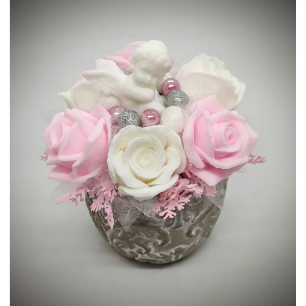 Szappanvirág csokor - rózsaszín-szappanvirág csokor - kis angyallal - kőkaspóban Kézzel készített, illatos szappan csokrok, asztali díszek, egyedi szappanok készítése.