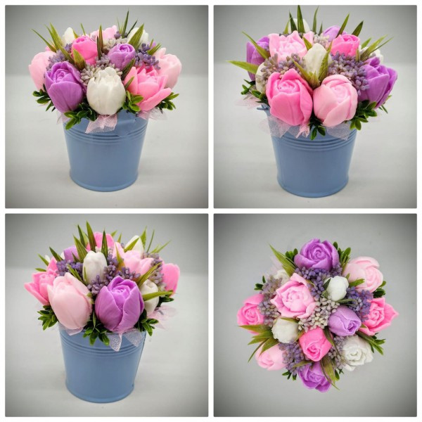 Szappanvirág csokor - rózsaszín tulipán szappanvirág csokor - kék fém vödörben - 6. Kézzel készített, illatos szappan csokrok, asztali díszek, egyedi szappanok készítése.