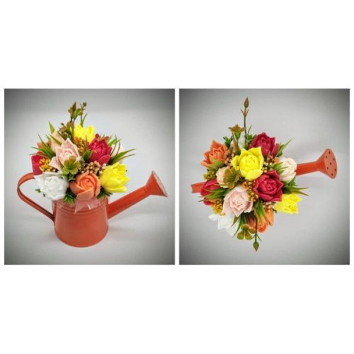 Szappanvirág csokor - Sárga-piros-barack vegyes tulipán szappancsokor - narancs locsolókannában - 5. Kézzel készített, illatos szappan csokrok, asztali díszek, egyedi szappanok készítése.