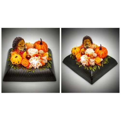 Szappanvirág csokor - sünivel - halloween csokor - barna műanyag tálban