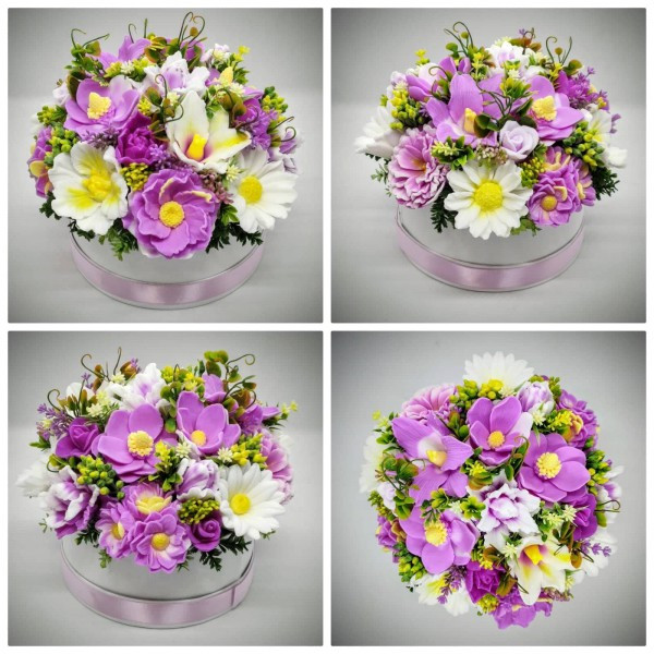 Szappanvirág csokor - tavaszi nagy szappancsokor - nagy fehér kör dobozban Kézzel készített, illatos szappan csokrok, asztali díszek, egyedi szappanok és fürdősók