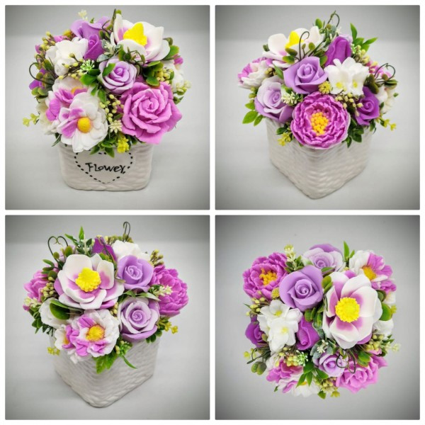 Szappanvirág csokor - tavaszi vegyes - szappanvirág csokor - fehér kocka kaspóban - 1. Kézzel készített, illatos szappan csokrok, asztali díszek, egyedi szappanok készítése.