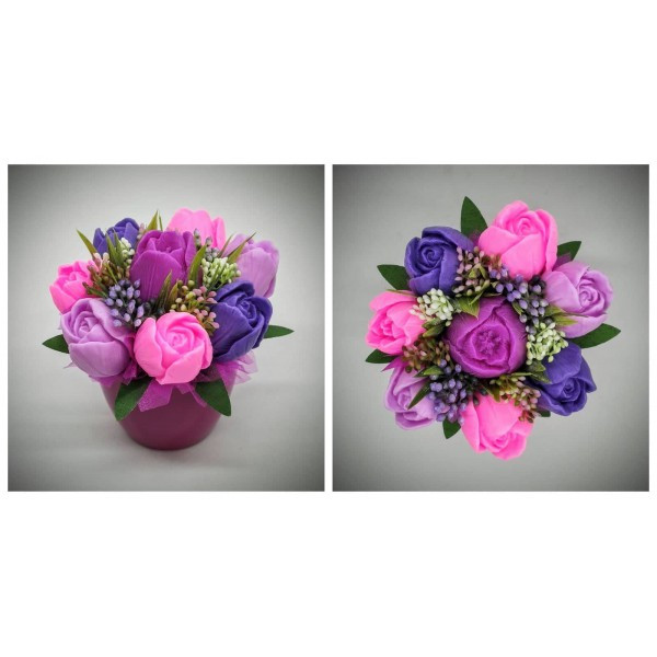 Szappanvirág csokor - Vegyes lilás tulipán szappancsokor - kis fukszia kaspóban - 1. Kézzel készített, illatos szappan csokrok, asztali díszek, egyedi szappanok és fürdősók