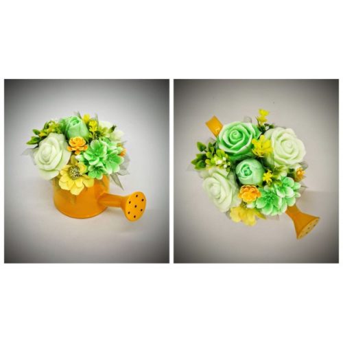 Szappanvirág csokor - zöld csokor - sárga locsolókannában Kézzel készített, illatos szappan csokrok, asztali díszek, egyedi szappanok készítése.