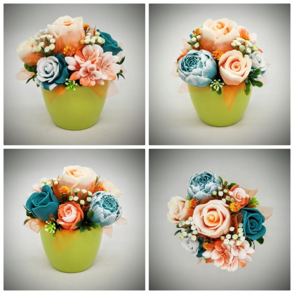 Szappanvirág csokor - zöld-narancs csokor - kis zöld kaspóban - 1. Kézzel készített, illatos szappan csokrok, asztali díszek, egyedi szappanok és fürdősók