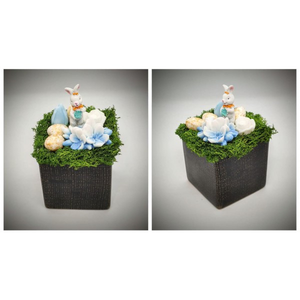 Szappanvirág - Húsvéti csokor - kék - fehér nyuszival - fekete kocka kaspóban 2.