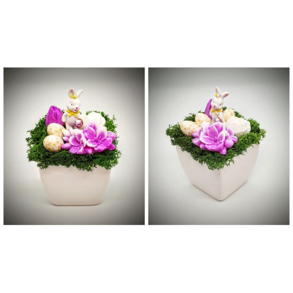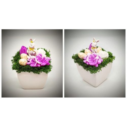 Szappanvirág - Húsvéti csokor - rózsaszín - fehér nyuszival - fehér kocka kaspóban 1.