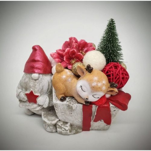 Szappanvirág - karácsonyi csokor - őzike - piros csillagot tartó manós kaspóban - zöld fenyővel - 3.