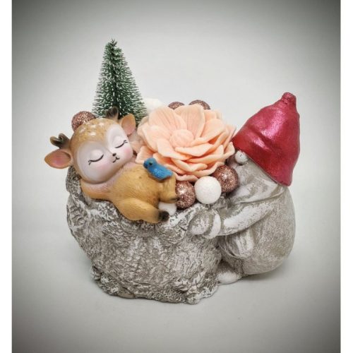 Szappanvirág - karácsonyi csokor - őzike - piros sapkás manós kaspóban - zöld fenyővel - 1.