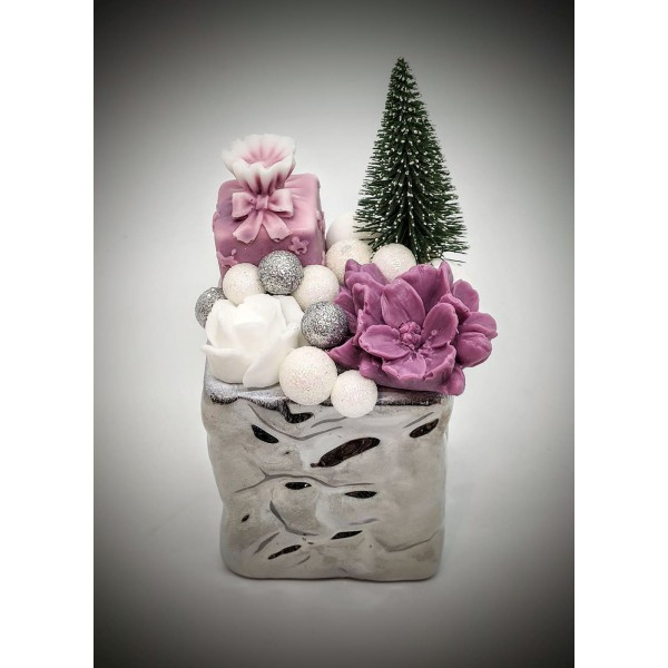 Szappanvirág - karácsonyi - lilás ajándék csomaggal - virággal - ezüst színű kocka kaspóban