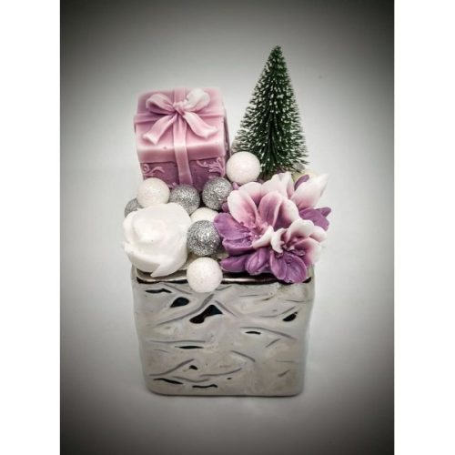 Szappanvirág - karácsonyi - lilás ajándék dobozzal - virággal - ezüst színű kocka kaspóban