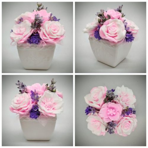 Szappanvirág - rózsaszín szappancsokor - fehér kocka kaspóban - 4. Kézzel készített, illatos szappan csokrok, asztali díszek, egyedi szappanok készítése.