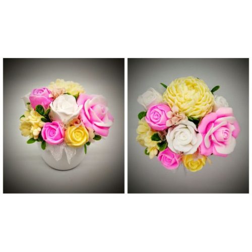 Szappanvirág - sárga-rózsaszín-fehér szappancsokor - fehér kaspóban Kézzel készített, illatos szappan csokrok, asztali díszek, egyedi szappanok készítése.