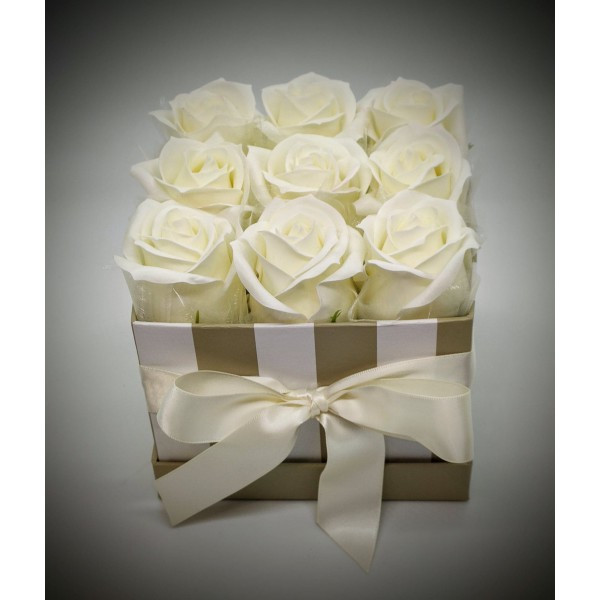 Szappanvirág - vajszínű szappanrózsa box - csíkos dobozban Kézzel készített, illatos szappan csokrok, asztali díszek, egyedi szappanok készítése.